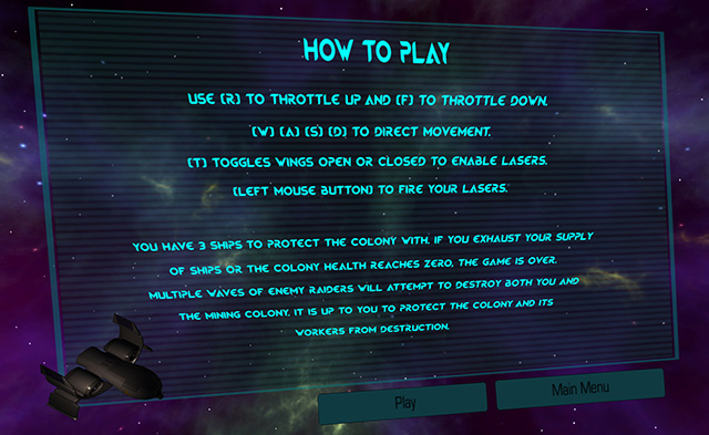 The purpose of this project was to both design and compose the scripts that would make the game function. The general premise of the game is that the player is a space pilot in a small ship tasked with protecting a mining colony on a large asteroid. While on patrol, the base comes under attack from pirates, and the player must defend it. Art assets for this were primarily from the Unity Asset store, with some supplimental material created by hand, such as the icons and menu segments.