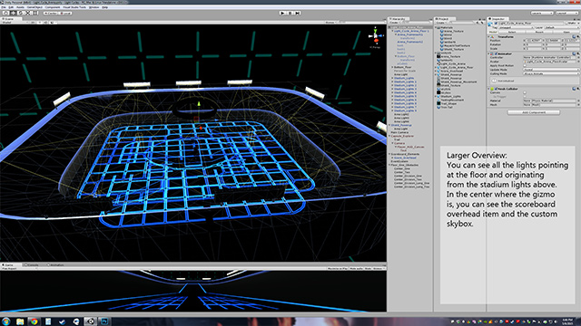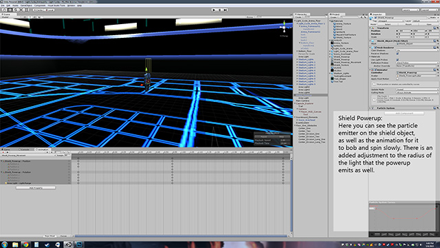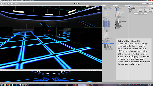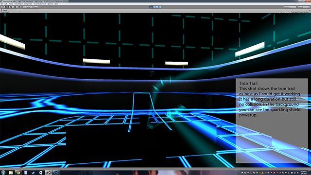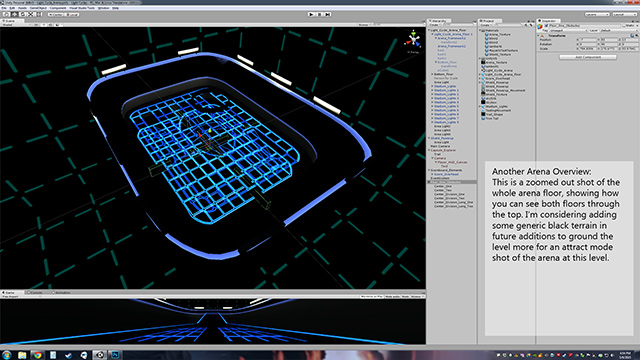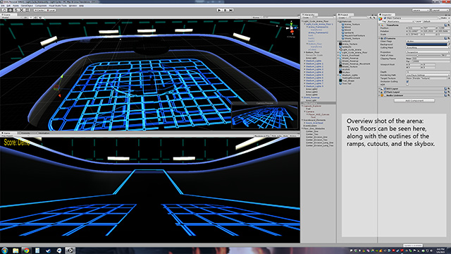The purpose of this level design was to try to recreate the feeling of the Light Cycle battle in Disney's Tron Legacy. The arena was made to emulate the scene where Sam Flynn races against Clu's riders and eventually escapes with Quorra. The level was first designed on paper and then constructed in Maya so that the custom geography could be created. Simple texturing was done in Photoshop, and everything was assembled within Unity. While this never made a fully playable game, the level does allow the player to navigate around, interact with powerups, and leave a visual light trail behind it.